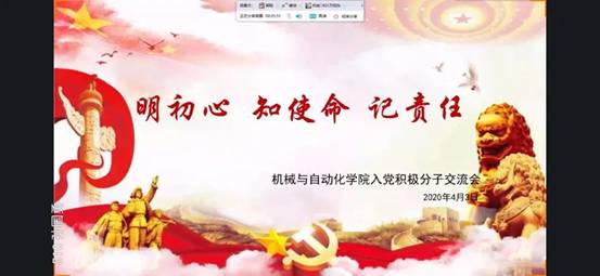 为进一步加强对入党积极分子的管理。4月3日,机械学院学生党支部召开主题为“明初心,知使命,记责任”的线上主题教育活动,活动以树立正确的入党动机,端正入党态度为切入点,通过分享全国防疫期间优秀党员代表的先进事迹,明确入党积极分子要端正入党动机。会议由学生党员王昌乐主持。