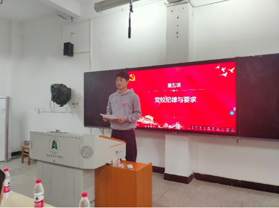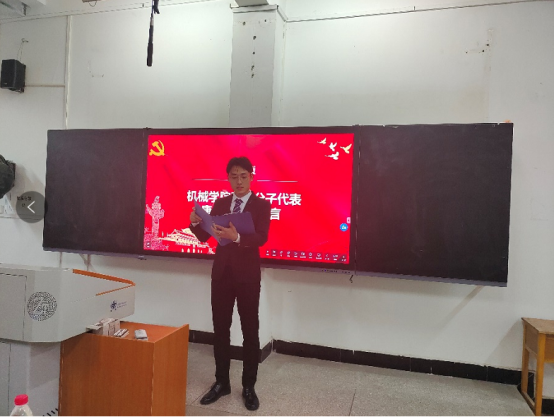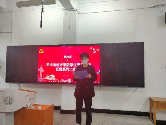 艺术与设计学院入党积极分子代表任世豪上台发言,表示党员和入党积极分子应认真学习党的指导思想,努力将自身学习发展与时代、国家发展紧紧相连,以实际行动向党组织靠拢,坚持思想上先入党,行动上以党员标准严格要求自己,立志做勇担民族复兴大任的时代新人。