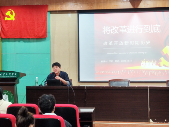 为了进一步加强党史学习教育,深入贯彻学习并把握习近平总书记“学党史、悟思想、办实事、开新局”的重要讲话精神。11月17号晚,beat365在线唯一官网联合艺术与设计学院学生党支部于学术报告厅202开展了“将改革进行到底”的专题党课,本次党课由机械学院学生党支部书记王松主讲,beat365在线唯一官网和艺术与设计学院第37期党校全体学员参与学习。