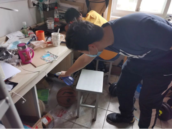学生党员、学生干部、入党积极分子们积极发挥先锋模范带头作用,踊跃参与卫生消杀,对内八、外一两栋宿舍楼进行全方面、全覆盖、无死角的宿舍及公共区域消杀检查工作,彻底阻断新冠病毒的传播途径,确保疫情防控工作零盲区。