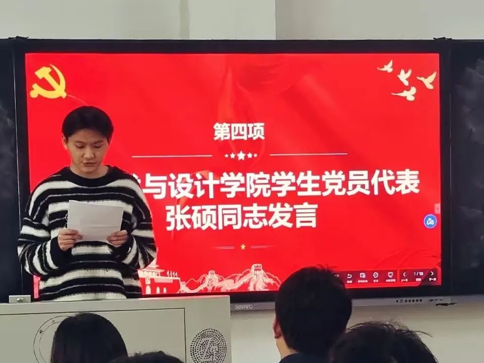 艺术与设计学院学生党员代表张硕上台发言,他对学员提出三点希望,一是对标优秀共产党员的标准,严格要求自己,内化于心,外化于行,实现思想认识和行动认识的高度统一。二要始终坚持高标准、严要求、严格要求自己。三是以党史为契机,进一步加强党性锻炼,不断提高个人素质修养。他倡导广大学员坚定不移听党话、跟党走,怀抱梦想,脚踏实地,做有理想、能吃苦、肯奋斗的新时代青年。