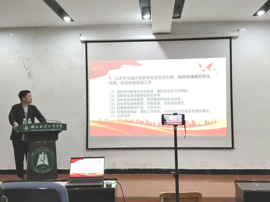 其次,陈书记以艺术与设计学院学生党支部为例,告诉同学们应当发挥先锋模范带头作用,促进党建团建工作。