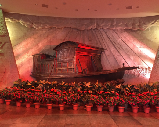 来到二楼展馆,这里的焦点莫过于“南湖红船”了。正是在这条红船上,诞生了伟大的中国共产党,建立了红色政权,这就是我们的起点,从此我们有了反抗、有了抗争、有了希望。在中华民族内忧外患、社会危机空前深重的背景下,在马克思列宁主义同中国工人运动相结合的进程中,中国共产党诞生了。中国产生了共产党,这是开天辟地的大事变。这一开天辟地的大事变,深刻改变了近代以后中华民族发展的方向和进程,深刻改变了中国人民和中华民族的前途和命运,深刻改变了世界发展的趋势和格局。展厅中一幅巨大的浮雕也呈现出革命星星之火正呈燎原之势,从第一次国共内战到八年抗战再到第二次国共战争,一位位革命烈士抛头颅洒热血,为革命献出了生命。今年是中国共产党成立95周年,也是中国工农红军长征胜利80周年,在95年波澜壮阔的历史进程中,中国共产党紧紧依靠人民,跨过一道又一道沟坎,取得一个又一个胜利,为中华民族作出了伟大历史贡献。正是他们全力抗战,才获得了最终的胜利。