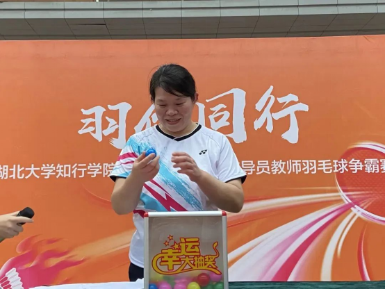 休息环节我们设置了抽奖活动,其中一等奖是一副羽毛球拍、二等奖是一个单肩包、三等奖是一双运动袜以及纪念奖是每一位参赛者都可以获得的。