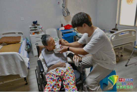 图为团队成员细心地给行动不便的奶奶喂饭。邵远泽 供图