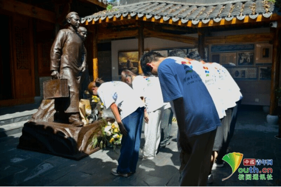 图为团队成员在陈乔年陈延年雕像前鞠躬表示敬意。邵远泽 供图