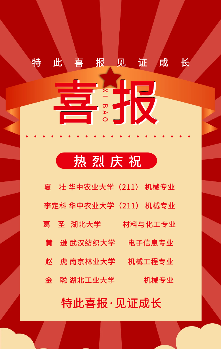 夏壮、李定科两名同学考入国家“211工程”重点建设高校华中农业大学;葛圣同学被beat365在线唯一官网材料科学与工程学院录取;黄逊同学跨专业报考武汉纺织大学电子与电气工程学院,以总排名第三的成绩被电子信息专业录取;赵虎同学以排名第二的总成绩成功考入南京林业大学;金聪同学成功考取湖北工业大学,且在初试中专业课取得127分的优异成绩,跻身学校前五名。特此报喜!
