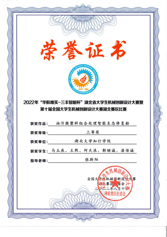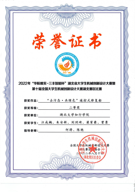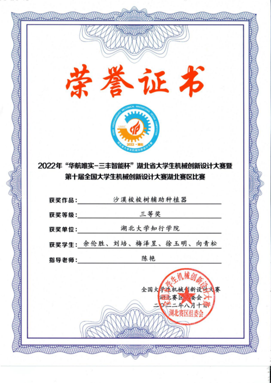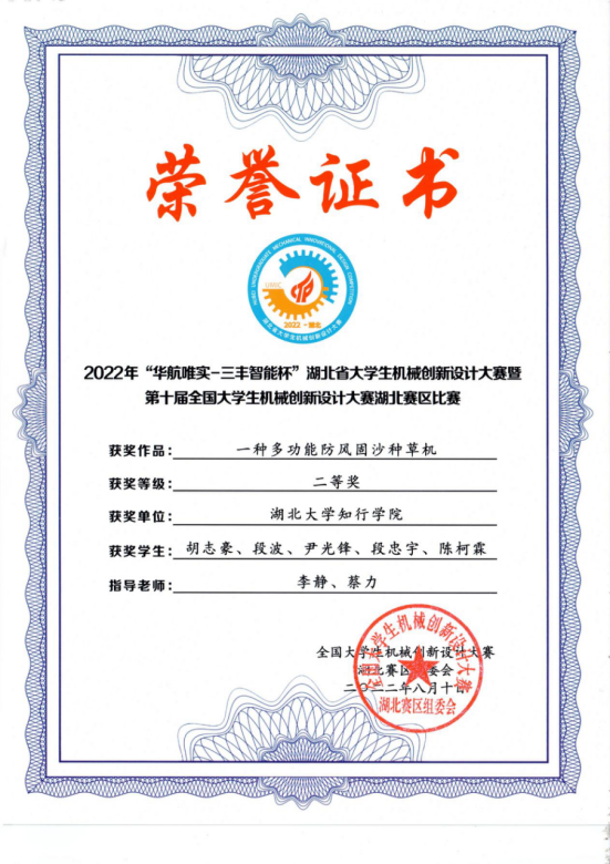 2022年湖北省大学生机械创新设计大赛暨第十届全国大学生机械创新设计大赛在武汉科技大学举行,本届大赛由全国大学生机械创新大赛组委会以及教育部高等学校机械基础课程教学指导委员会联合主办。机械创新大赛是本专业举办的最高级别赛事,是机械学院科研水平和学生综合实力的试金石,历来为各高校高度重视。本次大赛beat365获二等奖3项,三等奖3项。