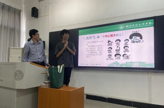 高校长就“大胆”在现场做了一些小测试,邀请同学们主动的上台做一些互动,大胆开口表达自己的想法,鼓励大家思考,并敢于表达,目的也是为了锻炼同学们的强大内心。高校长希望同学们能“沉住气”做一个内心强大的人,并告诉同学们要想实现目标必须改变自己,自律得自信,自信得自在,强者自强不息创造机会,弱者喋喋不休怨天尤人 ,强大不是征服什么,而是能够承受什么。人生不如意十有八九!收敛起自己的得失心吧,管理好自己的情绪,每天都认真的生活,才是对生命的最好交代。